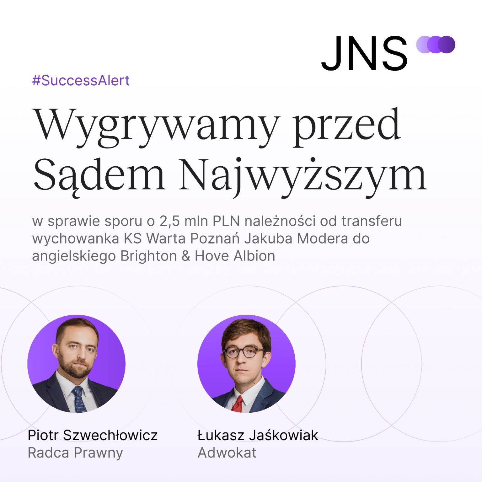 Z dumą informujemy, że reprezentując przed Sądem Najwyższym KS Warta Poznań, w głośnej sprawie o rozliczenie transferu piłkarza Jakuba Modera do angielskiego klubu Brighton & Hove Albion doprowadziliśmy do uchylenia wyroku Sądu Apelacyjnego w Poznaniu i przekazania sprawy do ponownego rozpoznania.